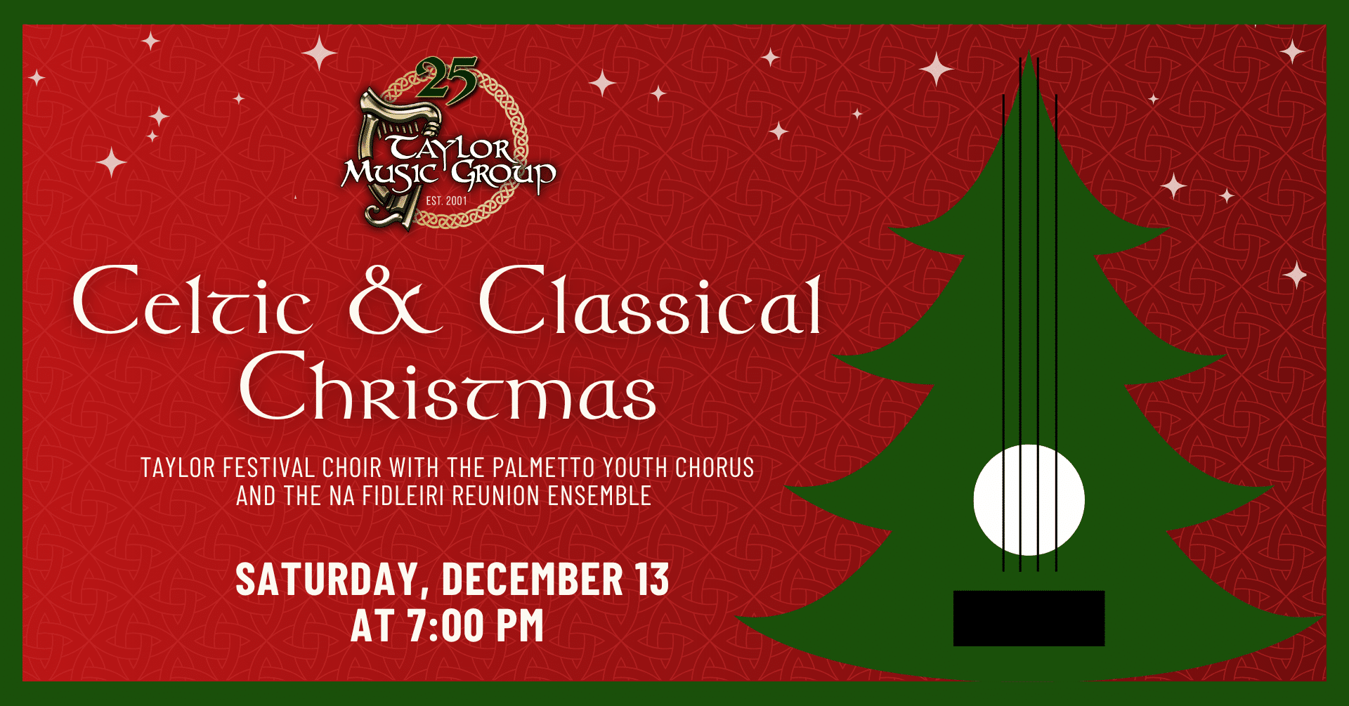 Whether you prefer serene carols sung by a choir, powerful operatic soloists, or toe-tapping Celtic instrumental offerings – this concert celebrates the Holiday season with something for everyone. Taylor Festival Choir is joined by the Palmetto Youth Chorus. This year we also celebrate Mary Taylor with a Na Fidleiri Reunion Ensemble, drawn from former members over Na Fidleiri’s 20 years of unique, magical music-making.