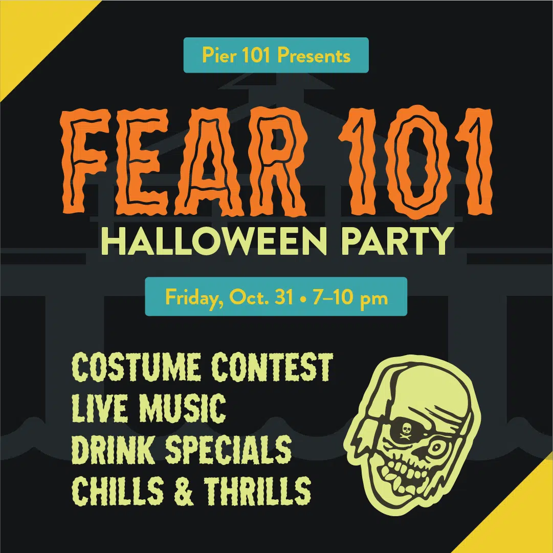 Join us for a FEAR 101 Halloween Party on October 31st from 7 pm to 10 pm. Experience a night of live music, costume contests, and eerie delights. Compete for the title of scariest, most creative, or best overall costume and win coveted prizes like Pier 101 merch, gift cards, and chilling trophies. Enjoy specialty cocktails, Jello shots, and food specials. Decorations and Halloween-themed treats will create a chilling atmosphere.
