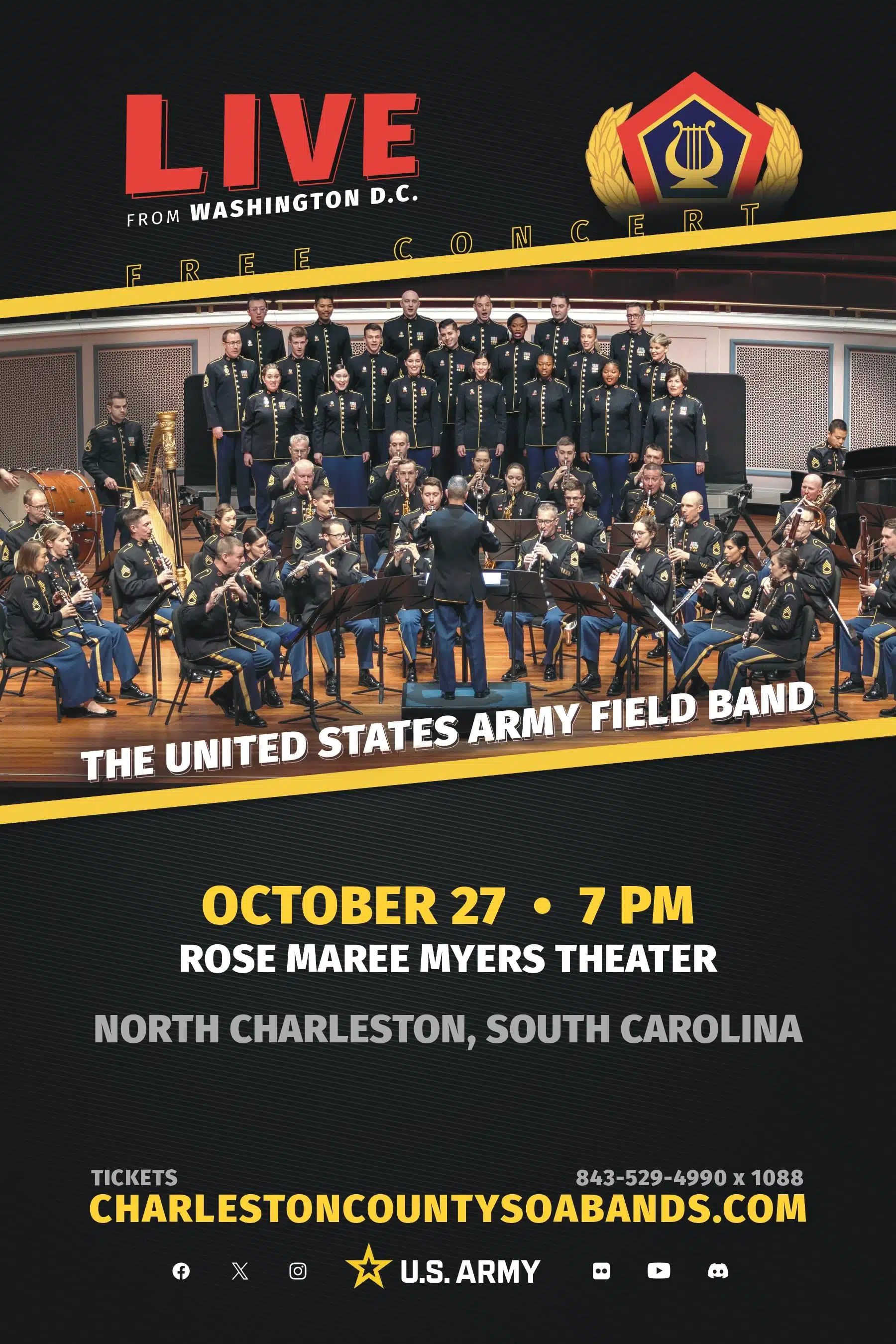 The United States Army Field Band from Washington, D.C., is the official touring musical representative of the U.S. Army. Their mission is to connect with Americans, share Army Stories, and honor Veterans as the Musical Ambassadors of the Army. These active-duty Soldiers tour nationally and internationally, performing for live audiences in large concert venues, while reaching hundreds of millions of enthusiastic followers online. Through performances in communities across the United States, The U.S. Army Field Band fosters a positive relationship with the American people, supports diplomatic efforts around the world, and inspires future generations to serve.